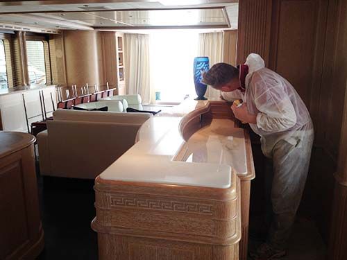 Le client cherchait une remise à niveau esthétique visible immédiatement, mais aussi une solution durable, adaptée au quotidien du bord (humidités, produits d’entretien parfois inadaptés, sel, variations de température, micro-rayures dues au sable et aux semelles). L’intervention a donc été conçue pour être efficace, propre, et compatible avec la logistique d’un yacht : maîtrise des poussières, protection des boiseries et éléments inox, séchage rapide et finitions sûres.